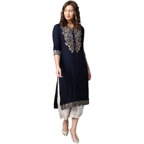 - Anubhutee Women’s Embroidered Straight Kurta suit set. Bottom-Palazzo, Fabric – Rayon, Color-Blue, Top Length- Calf. Has Round Neck, 3/4th Sleeves