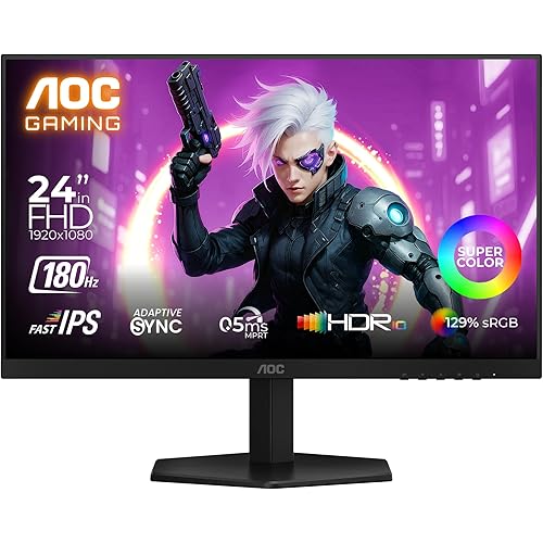 AOC 24G42E Gaming Monitor 24 inch FHD Fast IPS Gaming Monitor, 180Hz Refresh Rate, 0.5ms Response Time, Adaptive Sync, HDR10, Flicker-Free Technology, HDMI 2.0 & DisplayPort 1.4 Connectivity (Black)