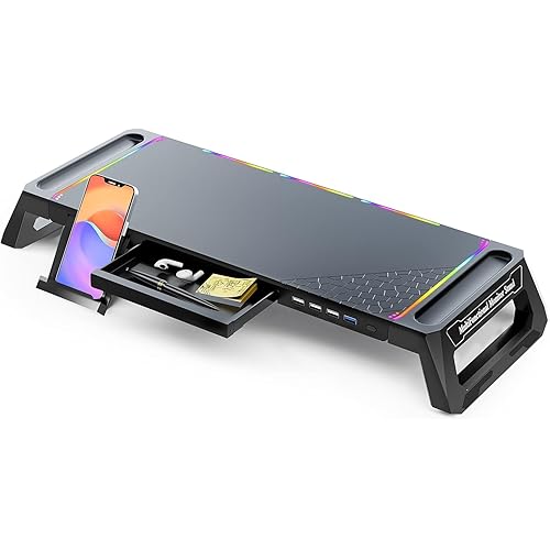 - Multifunctional monitor riser: Built-in mobile phone, tablet stand and storage box and RGB Lights make your desktop more compact