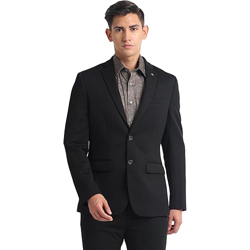 Notch lapel collar with metallic brand pin Single breasted with two button closure Long sleeves with buttoned cuffs Six pockets Double vented back