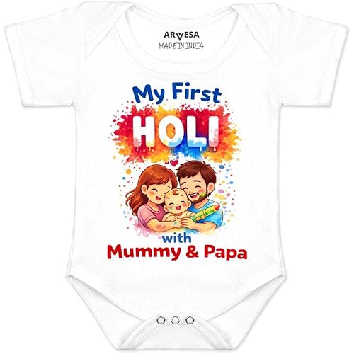ARVESA My First Holi Baby Romper for Baby Boy and Baby Girl White Cotton 0–12 Months Design No 2123 My First Holi Mummy & Papa
