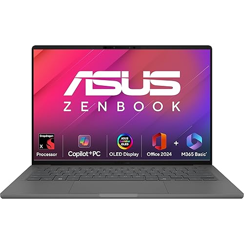 ASUS Zenbook A14, Snapdragon X Processor (Qualcomm Adreno iGPU/16GB RAM/512GB SSD/Windows 11 Home/MS Office 365 Basic (1Year)*/Office 2024/14″ FHD+ OLED/AI PC/Iceland Gray/0.98 kg), UX3407QA-QD259WS