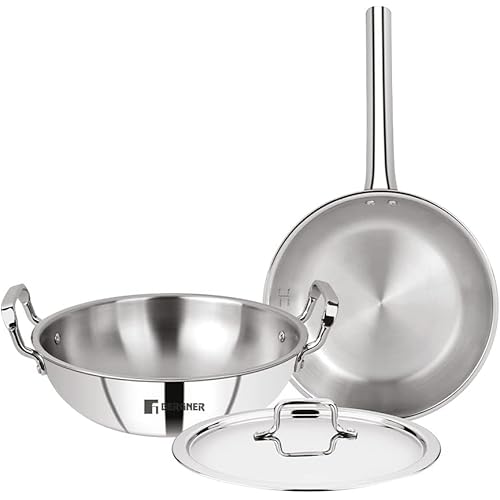 Bergner Tripro TriPly Stainless Steel 3 Pcs Cookware Set – 24cm (3L) Kadai with Lid, 22 cm (1.5 L) Frypan, Fast and Event Heating, Induction Bottom and Gas Stove Ready (5-Year Warranty by Bergner)