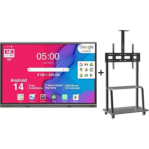 BIG VUE Android 14 Smart Interactive Digital Flat Panel Board, 8 GB RAM 256 GB ROM with TV Trolley Stand, Multitouch Screen Display for Teaching and Office Use (75 Inch + TV Trolley)