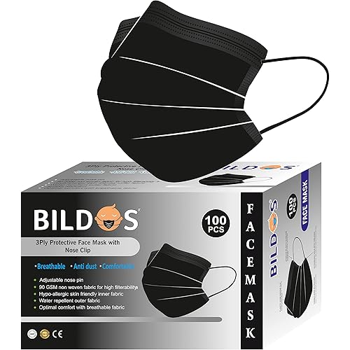 Bildos® Non-Woven Fabric 3 Layer Disposable Face Mask With Nose Clip (Black) For Men & Women (100)