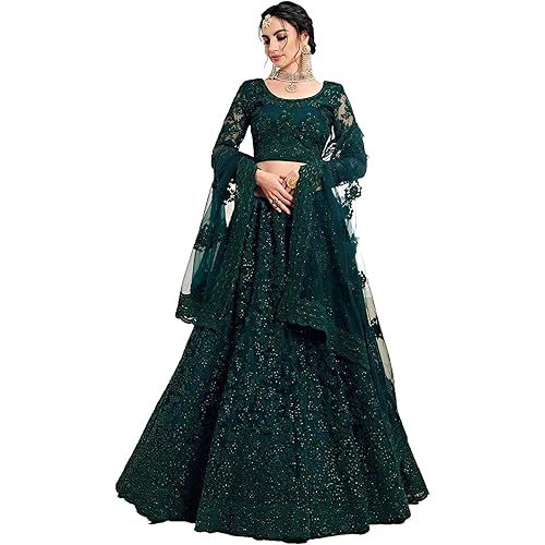 Bollyclues Women’s Net Embroidered Semi-Stitched Lehenga Choli(Green-Rani_Green_Free Size)