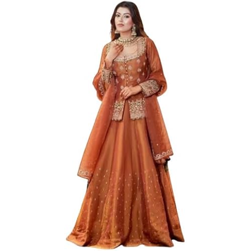Fabric: Silk::Kurta Color: Orange Length: Ankle Length::Top Shape: Short Top Package Contents :: One Kurta, One Lehaga , One Dupatta Size Guide :: To ensure that our garments fit you well, it is important that you pick the right size. Method to Measu… read more