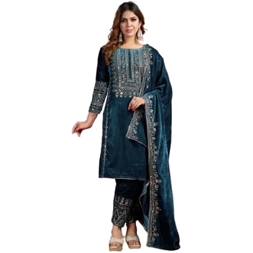 Fabric: Velvet::Kurta Color Teal Length: Knee Length::Top Shape: Straight Package Contents :: One Kurta, One Pant , One Dupatta Size Guide :: To ensure that our garments fit you well, it is important that you pick the right size. Method to Measure : … read more