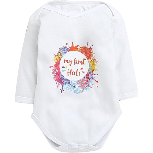 Round Chest – 45 cms :: Length – 36 cms. 100% Super Soft Baby bodysuits Colorful & Playful Designs Perfect Gift: Perfect as a little gift for Little one Unisex My First Holi Bodysuit