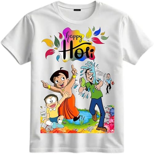 Celebrate Holi with Chota Bheem and Nobita Printed Unisex Half Sleeve Round Neck White Tshirts for Kids|White Polyotton Round Neck Kids Unisex Girls|Boys|Men Half Sleeve T-Shirt
