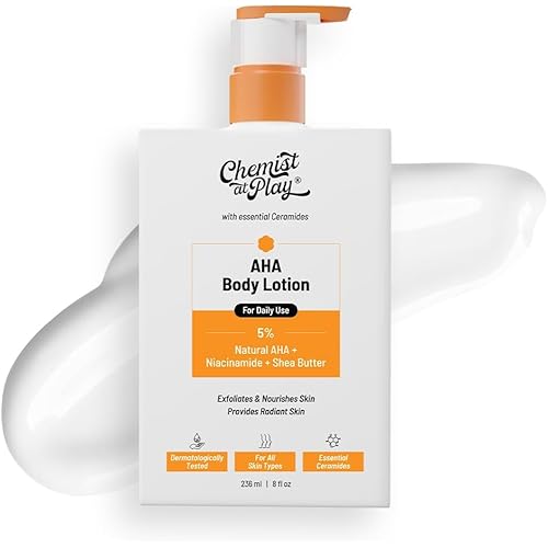 Chemist At Play AHA Body Lotion with 5% Natural AHA, Niacinamide, Shea Butter | For Exfoliating Dry & Dead Skin Cells, Deep Nourishment & Radiant Skin | Skin Brightening Lotion | 236ml