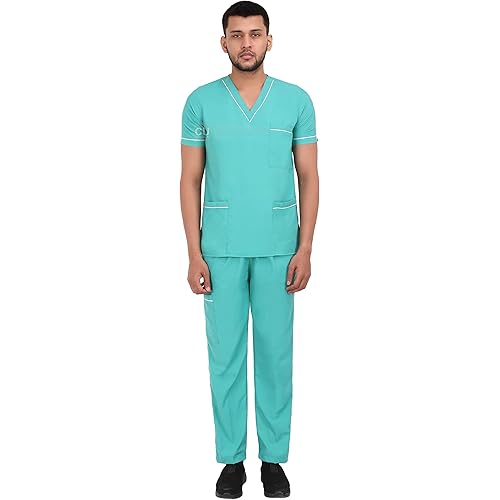 ChiefUniforms Scrub Suit set with piping For Male V-Neck 3 Pocket Top and Cargo Type Trouser (38-M, Sea Green)