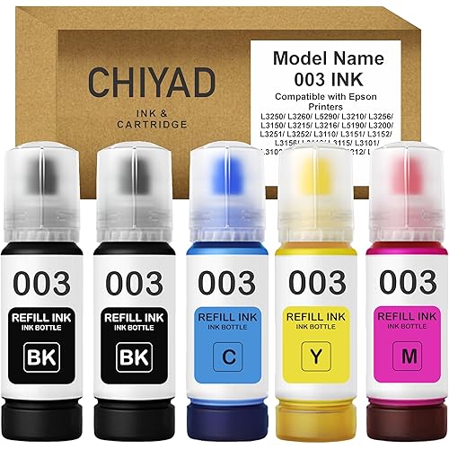 - Printer specific ink for Epson L3250 L3260 L5290 L3210 L3256 L3150 L3215 L3216 L5190 L3200 L3251 L3252 L3110 L3151 L3152 L3156 L3211 L3212 L1110 Printer – All Printer models compatible with OEM 003 Ink code