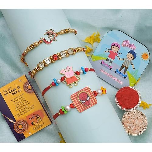 - Rakhi Combo Package Content (7 Items): 4 Premium Rakhis (1 Premium Colorful Beads Rakhi for Brother Bhaiya, 1 Designer Om Rakhi for Bhaiya, 1 Kids Rakhi for Kids Brother, 1 Kids Rakhi for Girls Sister ), 1 Best Wishes Rakhi Card, 1 Magnet for Fridge Door