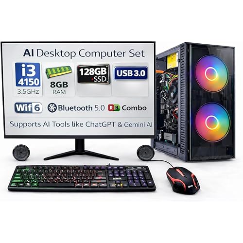 Desktop Computer Set with 20″ LED Monitor – Core i3-4130 3.4GHz, 8GB DDR3 RAM, 128GB SSD, WiFi 6, Bluetooth 5.0, RGB Combo, Supports AI Tools Like ChatGPT & Gemini AI