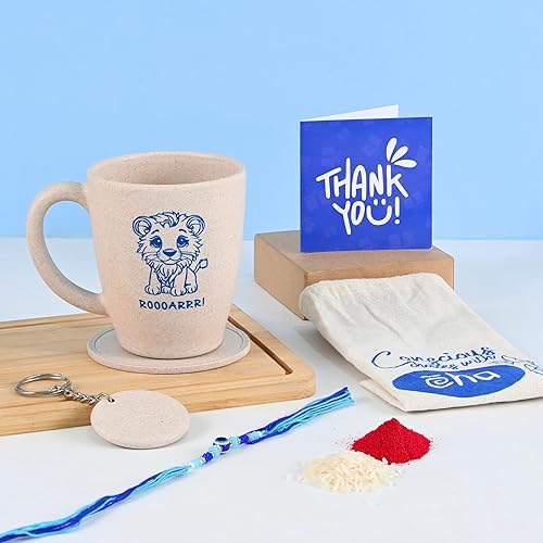 - GIFT SUGGESTION: This cute coffee mug is a top choice for its design and aesthetic appeal. This beautifully curated rakhi hamper for brother includes 1 rakhi set of evil eye rakhi, printed mugs, coaster, key chain, card, roli and chawal. Crafted from rice husk and bamboo fibers in natural colors, these mugs enhance your coffee-drinking experience. They also make a perfect Rakhi gift, combining love and care for nature.