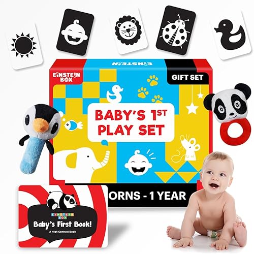 Einstein Box Gift Set for Babies and Newborns ages 0-3-6-9-12 Months | High Contrast Flash Cards for Visual Stimulation & Sensory Development | Gift Set of Rattles and High Contrast Book & Flash Cards