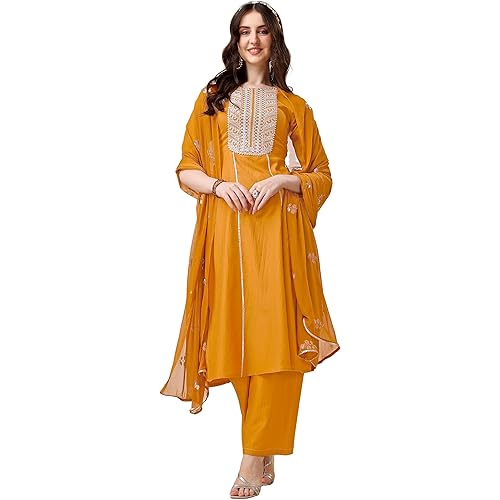 74 reviews for EthnicJunction Women’s Embroidered Thread Work Chinon A-Line Kurta Pant with Sequence Dupatta Set
