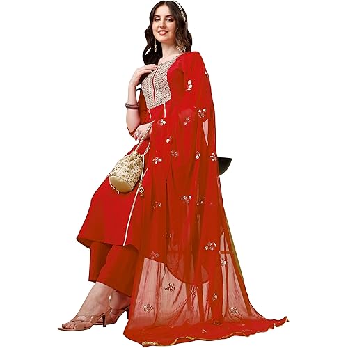Kurta Details || Fabric : Chinon | Color : Red | Pattern : Embroidered Thared Work | Style:- A-line Kurta | Neck : Round Neck | Sleeve : 3/4 Sleeve Bottom Details || Bottom Fabric : Chinon | Bottom Color : Red | Bottom Work : Solid | Bottom Style : P… read more