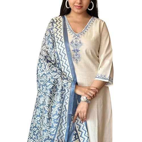 45512 reviews for FabDiamond Off White Embroidered Cotton Flex Suit Set with Cotton Silk Dupatta,Women Cotton Block Printed Kurta Pant With Dupatta
