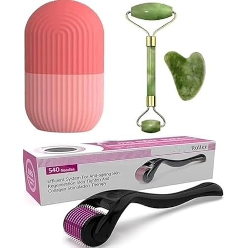 LIMESHOT Facial Massager Jade Roller & Gua Sha Tool Natural Himalayan Stone + Hair Growth Rollar 0.5Mm With 540 Titanium Alloy Needles + Ice Face Roller Silicone Facial Cube Set Of 3