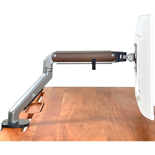 - Beautiful Design made with High Quality Material.The monitor arm is made with elegant die casting aluminium with aesthetically pleasing wooden accent. Integrated with innovative counterbalance technology. It can free up space on your desk and easily move your monitor into the best ergonomic position. Height adjustable arm moves up, down, forward and back with just a touch. With weight capacity of 9kg, this desk mount features 360° monitor rotation, 125° tilt, 180°swivel.