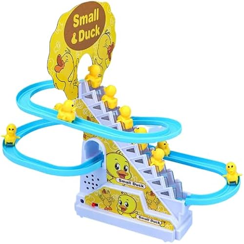 - This toy comes with 3 lovely yellow ducks, 1 stairs part as well as 3 sliding tracks. After assembly and start the toy, the ducks will be sent to the top one by one and then slide back to the starting point for the next round.