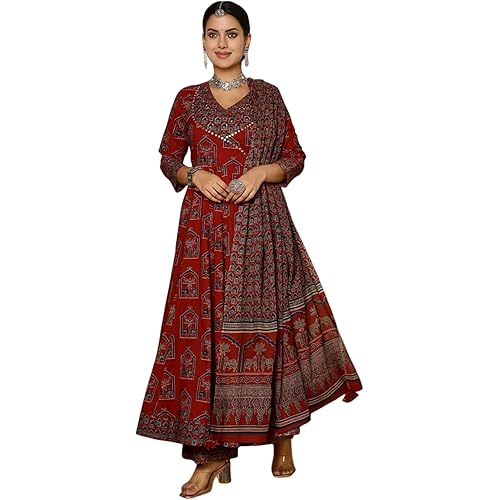 GEKHA|Women’s Red Cotton Printed Flared Kurta with Cotton Pant and Cotton Printed Dupatta Sets | Ethnic Set | Dupatta Set | Suit Set | Kurta Set | Wedding Suit Set