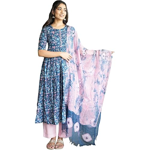 GoSriKi Women’s Cotton Blend Anarkali Printed Kurta with Pant & Dupatta