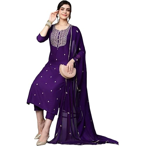 3956961 reviews for GoSriKi Women’s Cotton Blend Embroidered Kurta Set with Pant & Dupatta – Straight Calf‑Length, 3/4 Sleeve, Round Neck – Elegant Ethnic Attire (5 Colors, S–5XL)