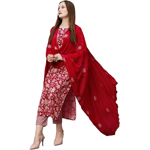 GoSriKi Women’s Cotton Blend Printed Straight Kurta with Pant & Dupatta