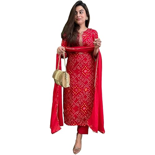 GoSriKi Women’s Rayon Blend Straight Bandhej Printed Kurta with Pant & Dupatta