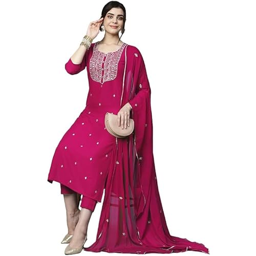 3656 reviews for HF HOLYDAY FASHION Straight Cotton Blend Designer Embroidered Work Sweetheart Round Neck Kurta Set with Pant & Dupatta for Women