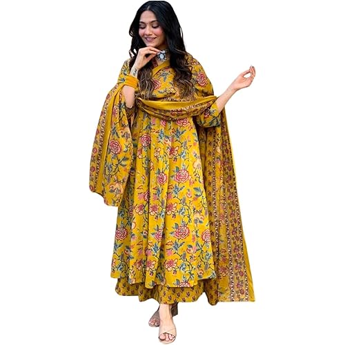 IKLO Women’s Heavy Cotton Anarkali Printed Kurta with Palazzo & Dupatta (Malmal) Yellow Floral Print
