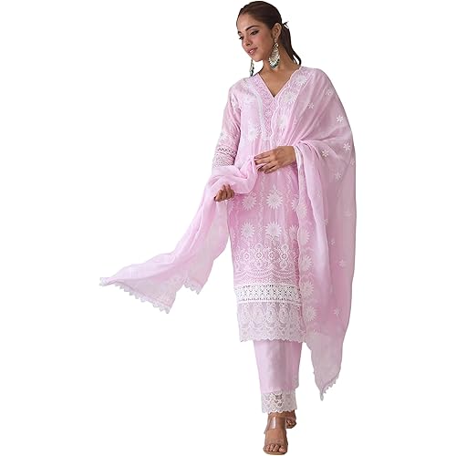 INDO ERA Women’s Embroidered Pure Cotton Kurta Pant With Dupatta Set