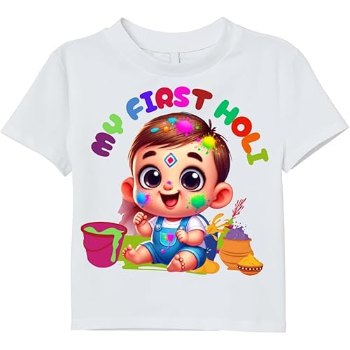 - Adorable Design: This t-shirt features an endearing Holi graphic, making it a delightful choice for children. Comfortable Fit: Crafted from high-quality cotton, this shirt offers a soft and cosy feel against the skin.