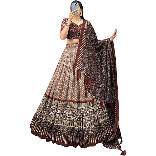 Jay Varudi Creation Lehenga Choli Women’s Trending Designeer Tussar Silk Lehenga Choli Print with Foil Work With Unstitched Blouse Patola Print Adorned with Foil Work For Navrati & Wedding (cofee f20)