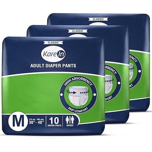 4257835 reviews for KareIn Classic Adult Diaper Pants, Medium 75 – 100 Cm (30″- 40″), 30 Count, Unisex, Leakproof, Elastic Waist, Wetness Indicator, Pack of 3