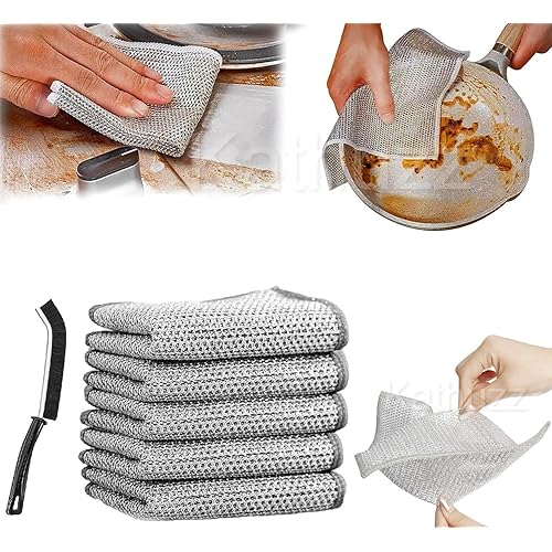 - GREAT KITCHEN HELPER COMBO: Our product includes 5 pcs multifunctional wire dishcloths with 1 pc crevice gaps cleaning brush, which is durable and a great addition to your kitchen. Dish wash cloth is of size: 20cm x 20cm, perfect for cleaning. Multipurpose wire dishwashing rags for wet and dry
