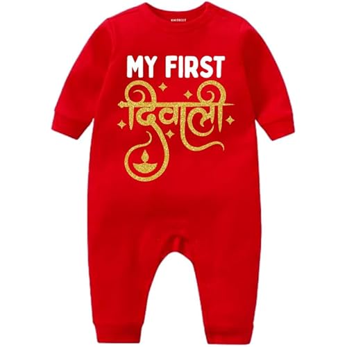 KNITROOT Diwali Jumpsuit, My First Diwali, Full Sleeve, Shoulder-Snap-Buttons, Knee Length, Cotton Unisex Jumpsuits, Rompers, Bodysuits for New Born Baby, Red, Infant Clothes for Boys & Girls