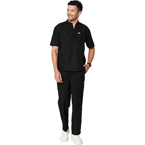 3 reviews for KNYA Classic Men’s 5-Pocket Mandarin Collar Scrub Suit| Regular fit | Short Sleeves | For Doctors | (M, BLACK)