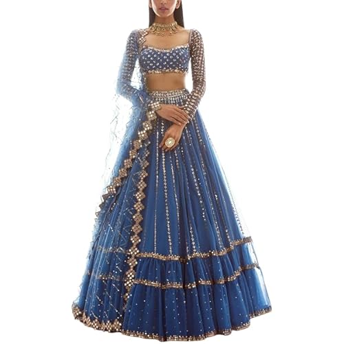 KOSTYLE Georgette Casual Stylish Sequence Embroidered Foil Mirror Semi-Stitched Lehenga Choli With Dupatta For Women (Blue)