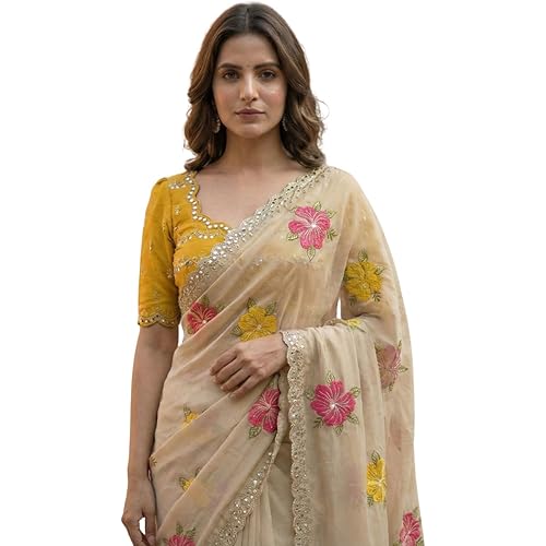 Kryone Collection Handcrafted Floral Embroidered Saree with Contrast Yellow Blouse
