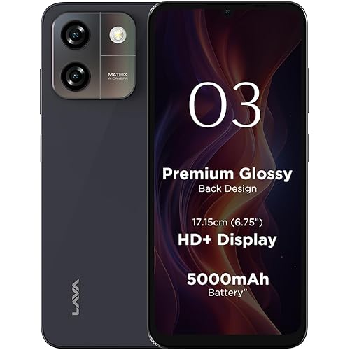 Lava O3 (Glossy Black, 4 GB RAM, 64 GB Storage) | Biggest 6.75″ HD+ Display | 13MP AI Dual Rear Camera | 5000 mAh Battery | Secure Face Unlock | Fingerprint Reader | Charger & Phone-Cover in Box