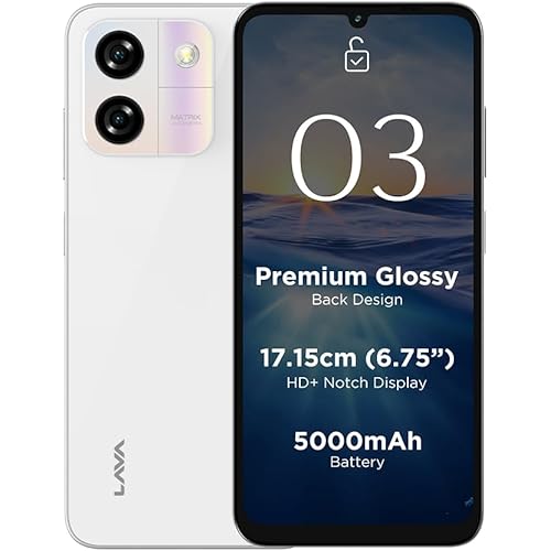 Lava O3 (Glossy White, 3 GB RAM, 64 GB Storage) | Biggest 6.75″ HD+ Display | 13MP AI Dual Rear Camera | 5000 mAh Battery | Secure Face Unlock | Fingerprint Reader | Charger & Phone-Cover in Box