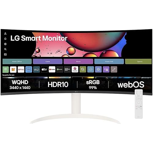 44510 reviews for LG 34SR65QC Curved (1800R) UltraWide 21:9 Smart Monitor, 34″ WQHD (3440×1440), HDR10, 99% sRGB(Typ.), 100Hz, Built-in Speaker, Height/Tilt Adjustment, webOS, AirPlay2, Bluetooth, HDMI, USB, White