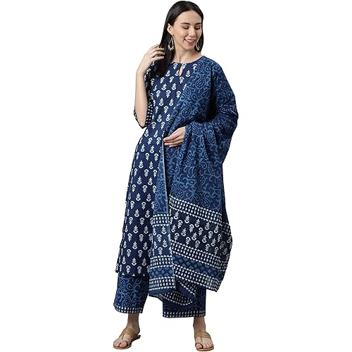 Top Color : Blue Set Contents : 1 Kurta 1 Palazzo 1 Dupatta Top Pattern : Printed Top Fabric : Cotton Occasion : Daily