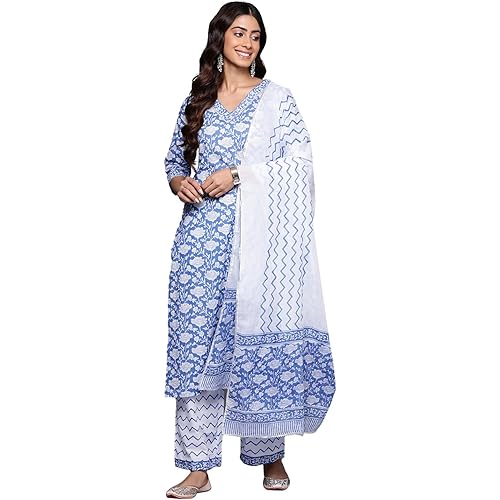 Libas Blue Printed Cotton Straight Kurta With Palazzos & Dupatta