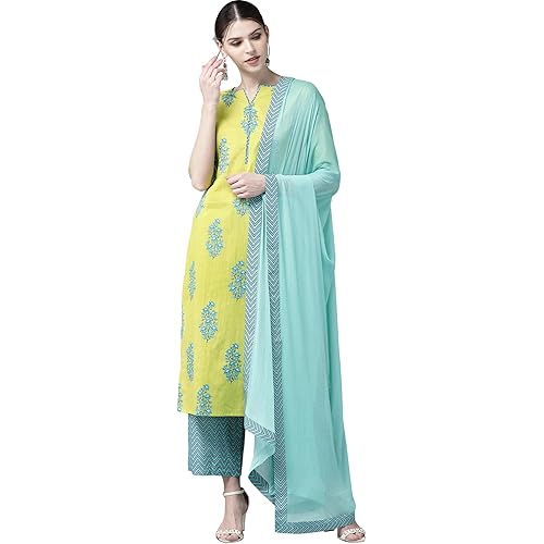 Top Color : Green Set Contents : 1 Kurta 1 Palazzo 1 Dupatta Top Pattern : Printed Top Fabric : Cotton Occasion : Daily