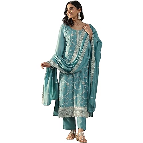 Libas Womens Embroidered Silk Blend Straight Kurta With Trousers and Dupatta